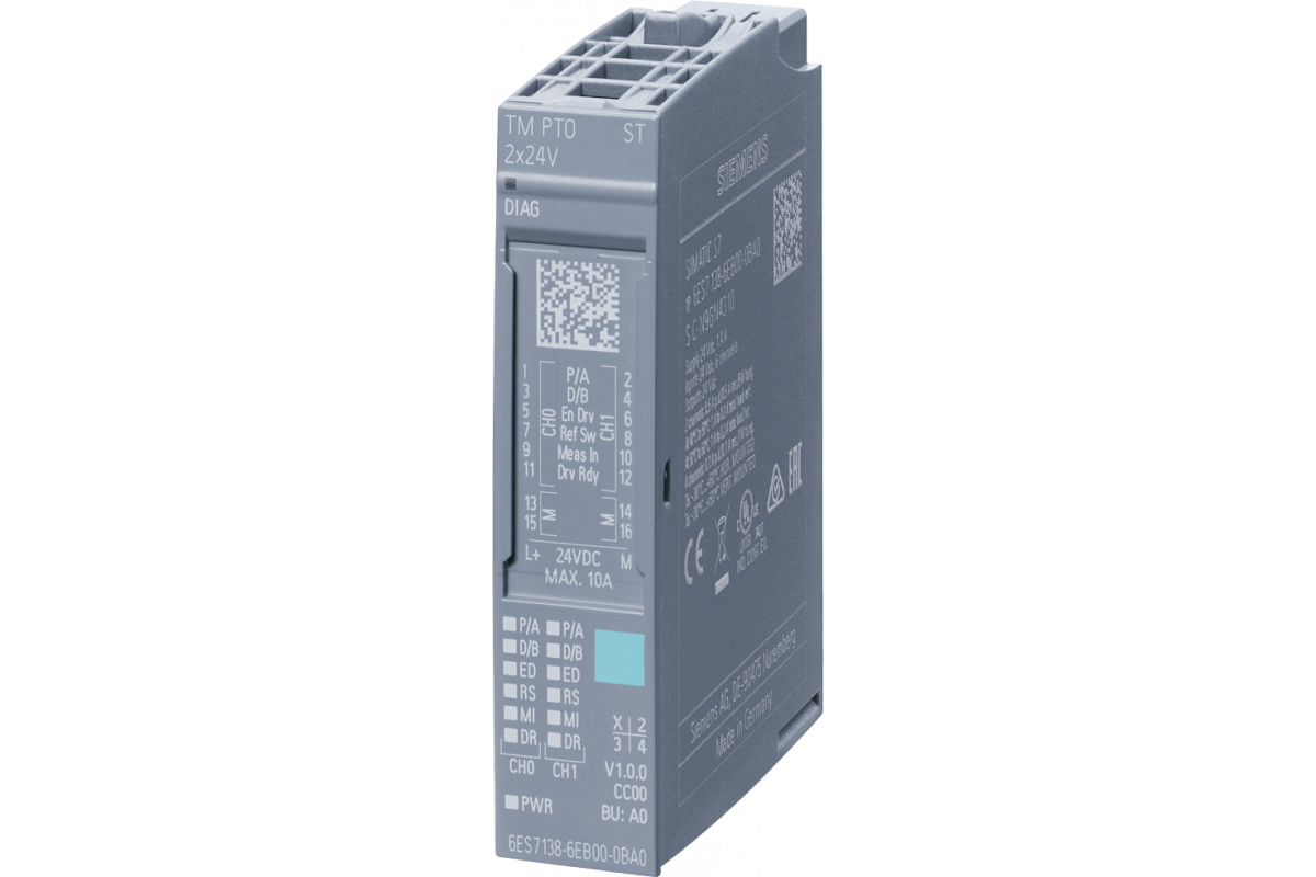 SIMATIC ET 200SP, TM PTO 2x24 В, интерфейсный модуль для шаговых приводов, 2 канала выхода импульсной последовательности, PTO: 24 В, 2 DI, 1 DQ 24 В DC на канал, подходит для BU типа A0