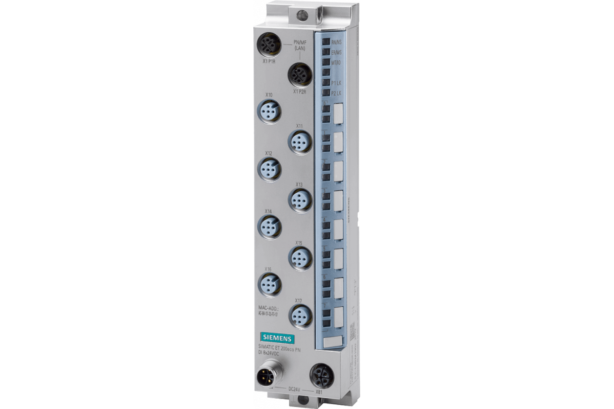 SIMATIC ET 200eco PN, DI 8x 24 В DC, M12-L, 8x M12, одинарное и двойное назначение, тип входа 3 (IEC 61131), вход с поглощением (PNP, вход с поглощением), задержка входа 0.05..20 мс, диагностика канала: обрыв провода на входе, короткое замыкание питания энкодера, 0.Изохронный режим 25 мс, приоритетный запуск, MSI, MRP, резервирование S2, I&M0...3, многополюсная шина, PN IO, Ethernet IP, Modbus TCP, степень защиты IP67 / IP69K