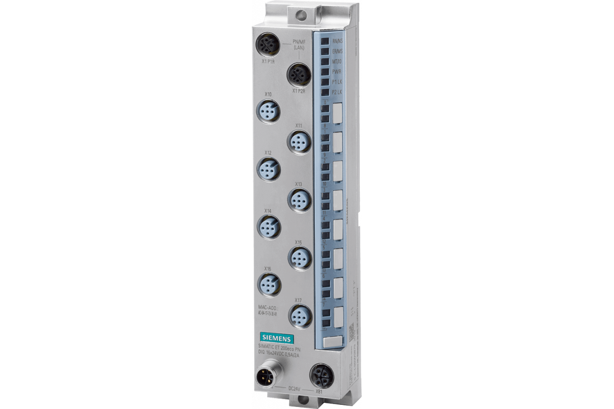 SIMATIC ET 200eco PN, DIQ 16x 24 В DC/0.5 A/2 A, M12-L, 8x M12, двойное назначение, тип входа 3 (IEC 61131), вход с поглощением (PNP, вход с поглощением), входная задержка 0.05..20 мс, выход источника (PNP, переключение на потенциал P), выход замещающего значения, диагностика канала: обрыв провода на входе, короткое замыкание источника питания энкодера, короткое замыкание на выходе, приоритетный ввод в эксплуатацию, MSI, MSO, MRP, резервирование S2, I&M0...3, многополюсная шина, PN IO, Ethernet IP, Modbus TCP, степень защиты IP67 / IP69K