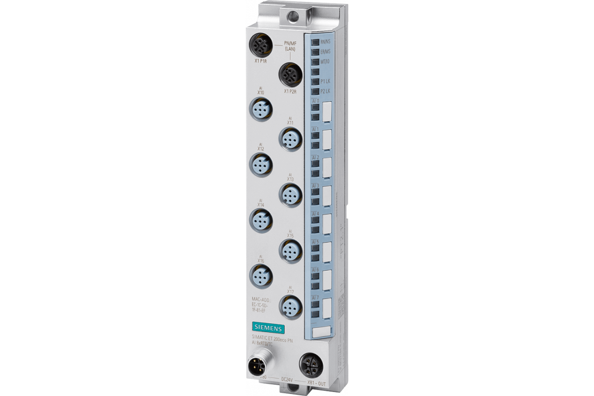 SIMATIC ET 200eco PN, AI 8xRTD/TC, M12-L, 8x M12, разрешение 16 бит, диагностика канала на обрыв провода на входе, общее устройство с 2 контроллерами, приоритетный запуск, MSI, MRP, резервирование S2, I&M0...3, многополюсная шина, PN IO, Ethernet IP, Modbus TCP, степень защиты IP67 / IP69K