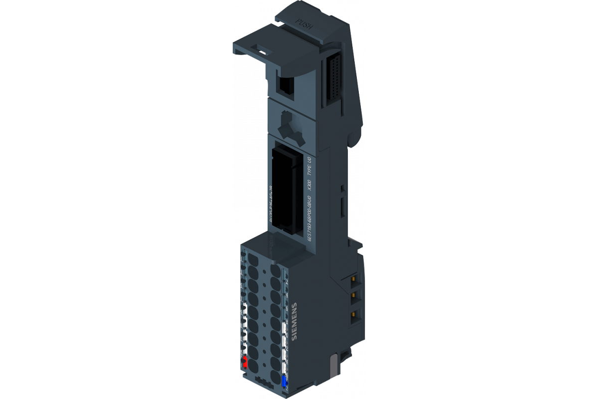 SIMATIC ET 200SP, базовый блок BU20-P16+A0+2B, BU типа U0, упаковка: 1 шт., втычные клеммы Push-in, без вспомогательных клемм AUX, подключение к существующей нагрузочной группе (базовому блоку слева), ШхВ: 20 мм x 117 мм