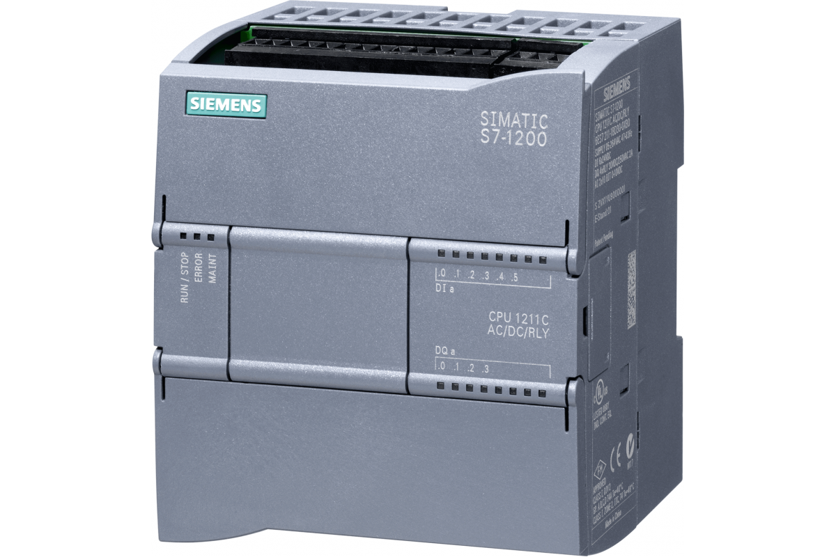 SIMATIC S7-1200, CPU 1211C, компактный CPU, AC/DC/реле, встроенный ввод/вывод: 6 DI 24 В DC; 4 DO реле 2A; 2 AI 0-10 В DC, Питание: 85-264 В переменного тока при 47-63 Гц, память программ/данных 50 КБ