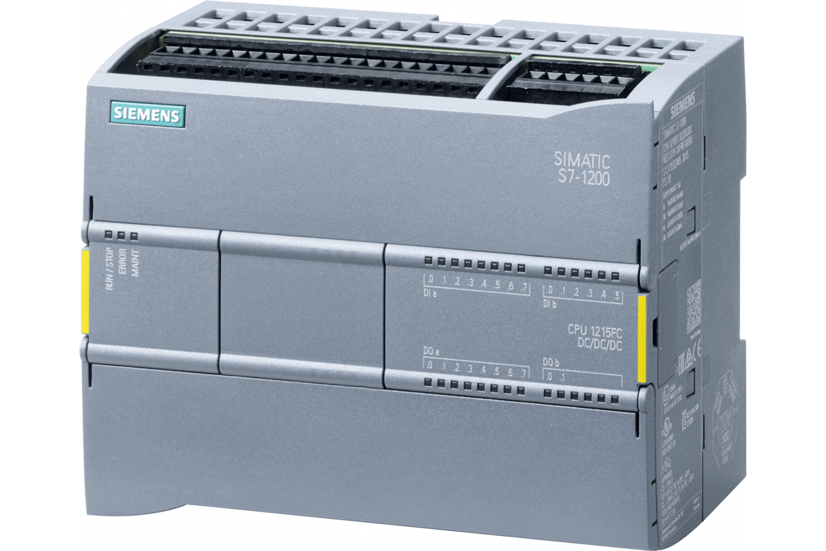 SIMATIC S7-1200F, CPU 1215 FC, компактный CPU, DC/DC/DC, 2 порта PROFINET, встроенный ввод/вывод: 14 DI 24 В ПОСТ. ТОКА; 10 DO 24 В ПОСТ. ТОКА; 0.5A; 2 AI 0-10 В DC, 2 AO 0-20 мА DC, Питание: DC 20.4-28.8 В постоянного тока, память программ/данных 150 КБ