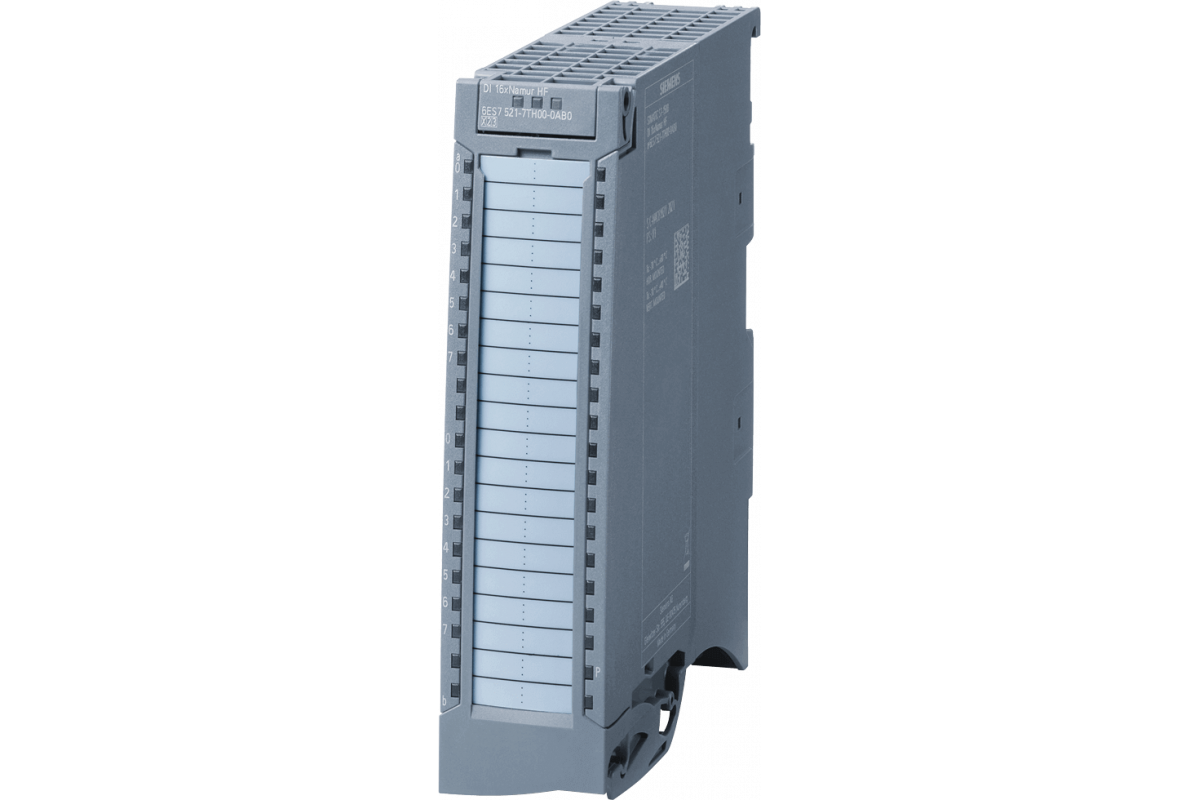 SIMATIC S7-1500, модуль цифрового ввода DI 16xNAMUR HF, 16 каналов в группах по 8; для 8.2 В Энкодер NAMUR; питание датчика 8.2 В; входная задержка; параметрируемая 0.05 ... 20 мс; встроенная функция счета до растяжения импульсов 20 кГц; контроль дребезга; диагностика инверсии сигнала; аппаратные прерывания; все необходимые компоненты для экранирования входят в комплект поставки; передний разъем (винтовые клеммы или push-in) заказывается отдельно