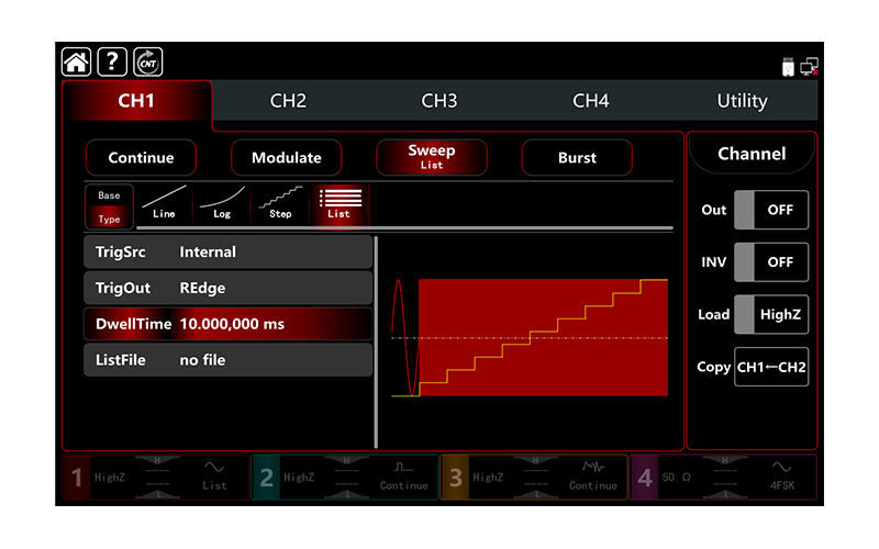 Помимо линейного и логарифмического режимов в традиционных режимах развертки, в серии UTG9000T добавлены два новых режима — пошаговый и списочный. Пошаговый режим обеспечивает точную и инкрементальную настройку, а списочный режим позволяет пользователям задавать конкретные значения или точки для развертки, обеспечивая точный контроль над генерируемыми сигналами.Эти режимы развертки расширяют функциональные возможности серии UTG9000T и позволяют генерировать широкий спектр сигналов.