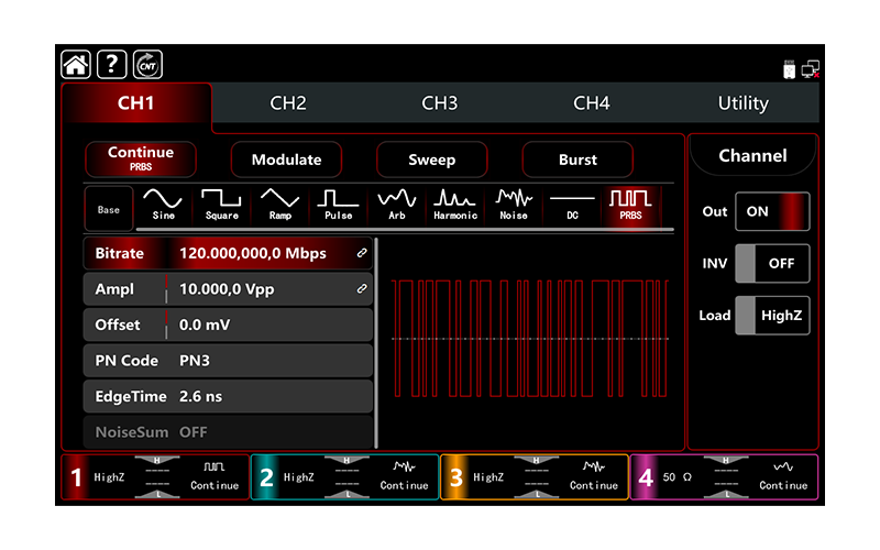 4-канальный выход, 4 режима развертки Серия UTG9000T оснащена стандартным 4-канальным выходом, позволяющим одновременно выводить четыре разных сигнала.