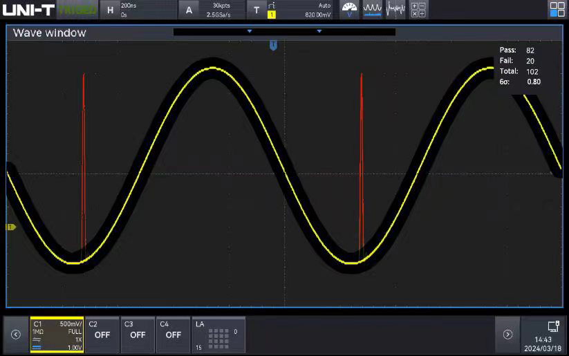 Аппаратно-ускоренное тестирование маски: стандарт 6σ < 1 с Стандарт 6σ (Шесть сигм) для электронных сигналов — это процесс с уровнем дефектности не более 3,4 дефекта на миллион возможностей (DPMO). Это означает, что на 1 000 000 образцов приходится всего 3,4 аномалии. Благодаря сверхвысокой скорости аппаратного захвата тестирование шаблонов с аппаратным ускорением сохраняет полную скорость захвата Ultra Phosphor 3.0 и позволяет выполнять проверку формы сигнала на соответствие конкретным стандартам за 1 секунду (вместо нескольких часов).