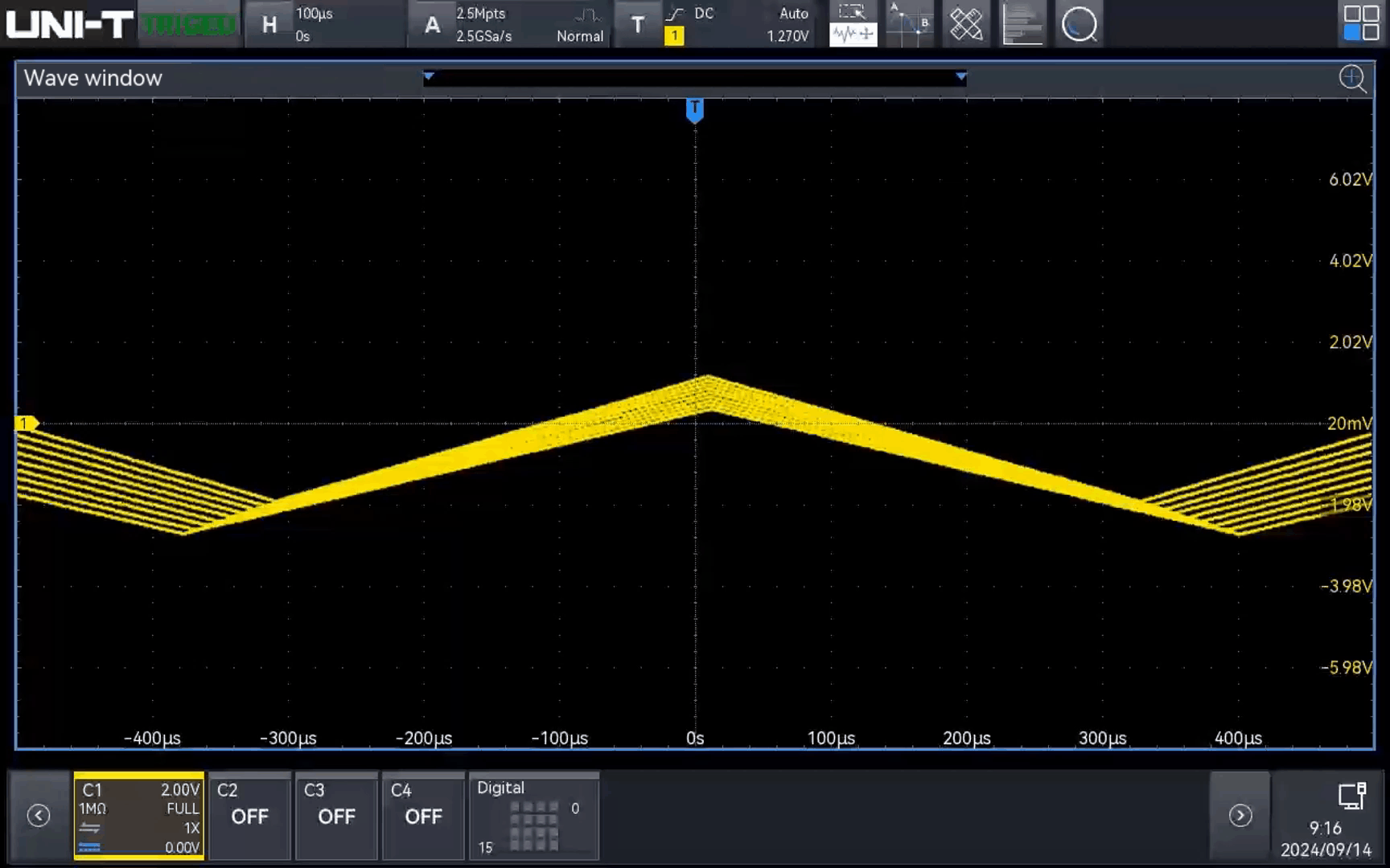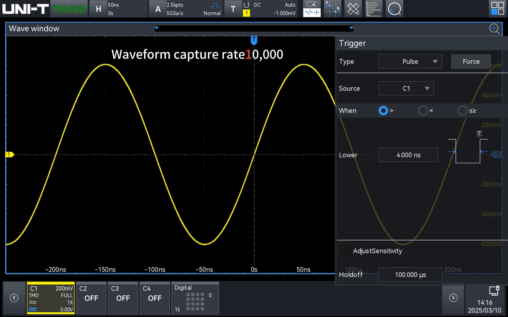 Повышенное разрешение 16 бит Более высокая точность, более низкий уровень шума. В 16-битном режиме высокого разрешения за счёт сочетания 12-битного АЦП с 4-битным ERES (повышенным разрешением) значительно повышается точность измерений, что позволяет чётко отображать сложные детали сигналов. Это эффективно подавляет внеполосный шум и снижает уровень шума, присущего осциллографу, который мешает восприятию реального сигнала, тем самым обеспечивая более точные измерения при увеличении количества отсчётов.