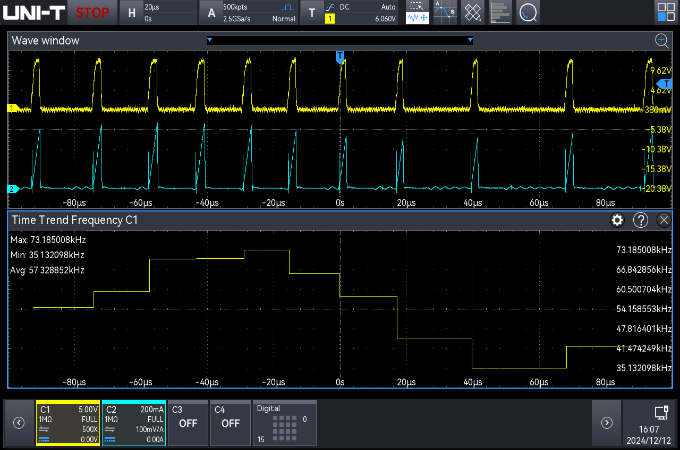 56 типов: измерения, статистика, графики тенденций 56 типов точных автоматических измерений параметров, охватывающих множество аспектов, таких как напряжение, частота, фаза и мощность. Кроме того, прибор оснащен расширенной статистикой параметров и функциями анализа с визуализацией графиков тенденций, что обеспечивает комплексное и многомерное отображение изменений характеристик сигнала, позволяя получать глубокие аналитические данные профессионального уровня и эффективно интерпретировать их.