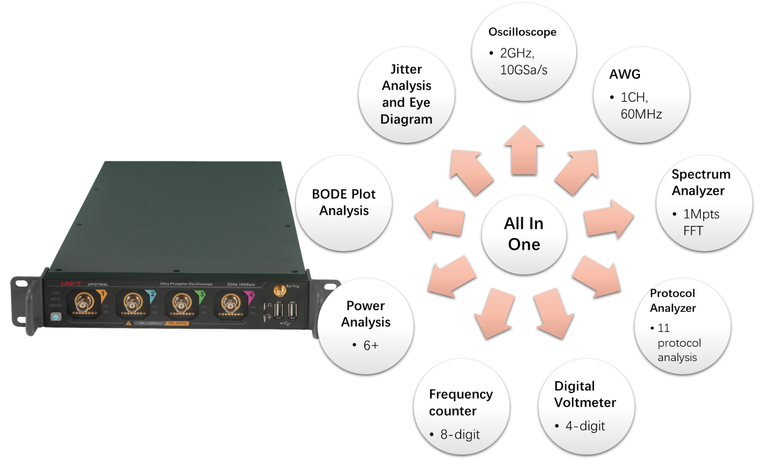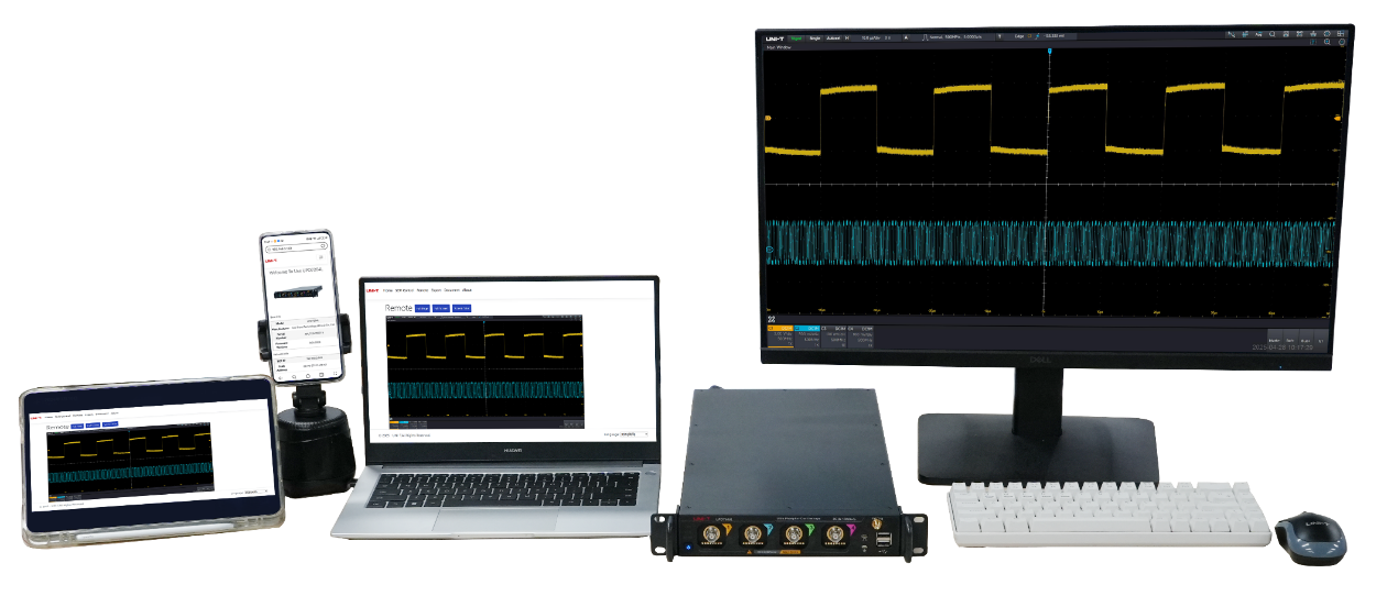 Серия UPO7000L Цифровые люминофорные осциллографы серии UPO7000L имеют компактную конструкцию для монтажа в стойку, а также тонкий и лёгкий корпус. Высота 1U предназначена для интеграции в многомашинные системы, установки в стойки высокой плотности и удалённого управления системой, что делает её идеальной для различных сценариев применения. Система поддерживает синхронное срабатывание нескольких устройств и может быть расширена до 128 осциллографов. Каждое устройство имеет 4 аналоговых канала, 1 канал внешнего запуска и 1 канал функционального генератора/генератора произвольной формы сигнала. Благодаря плоской конструкции корпуса и ножкам-подставкам осциллографы легко штабелировать и упорядочивать. Использование платформы серии 7000 обеспечивает плавный переход для пользователей, знакомых с работой с приборами серии 7000X. Кроме того, можно подключить внешний сенсорный дисплей, что обеспечит удобство работы с сенсорным экраном, как в серии 7000X.